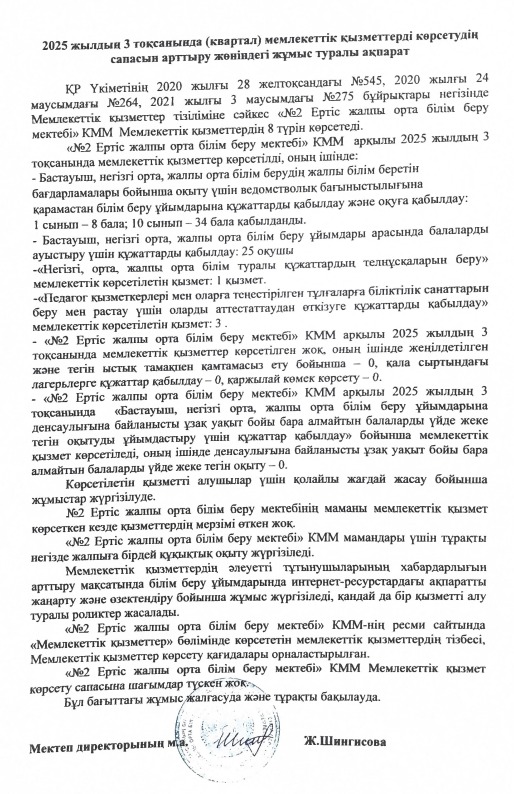 Павлодар облысының білім басқармасы, Ертіс ауданының білім бөлімінің "№2 Ертіс ЖОББМ" коммуналдық мемлекеттік мекемесінің 2024 жылғы Мемлекеттік қызмет көрсету мәселелері жөніндегі