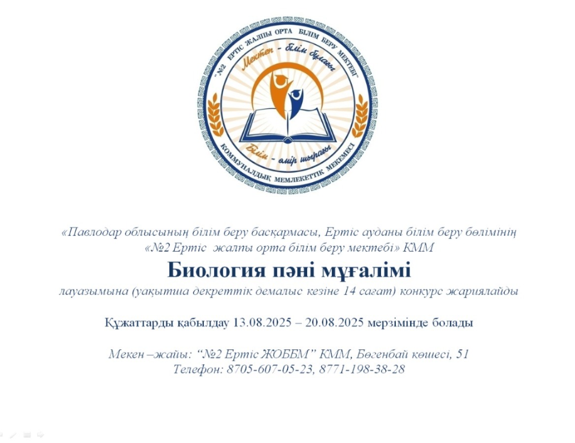 - Биология пәні мұғалімі (14 сағат) Құжаттарды қабылдау 13.08.2025-20.08.2025 аралығында Бөгенбай батыр көшесі, 51 үй мекен жайы бойынша қағаз жүзінде қабылданады
