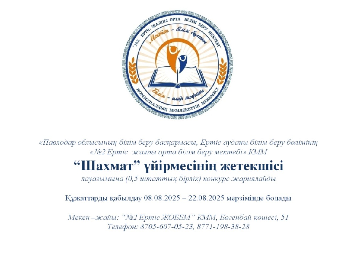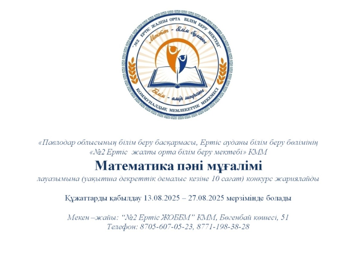 Павлодар облысының білім беру басқармасы, Ертіс ауданының білім беру бөлімінің «№2 Ертіс жалпы орта білім беру мектебі» КММ мемлекеттік тілде келесідей мамандықтарға конкурс жариялайды