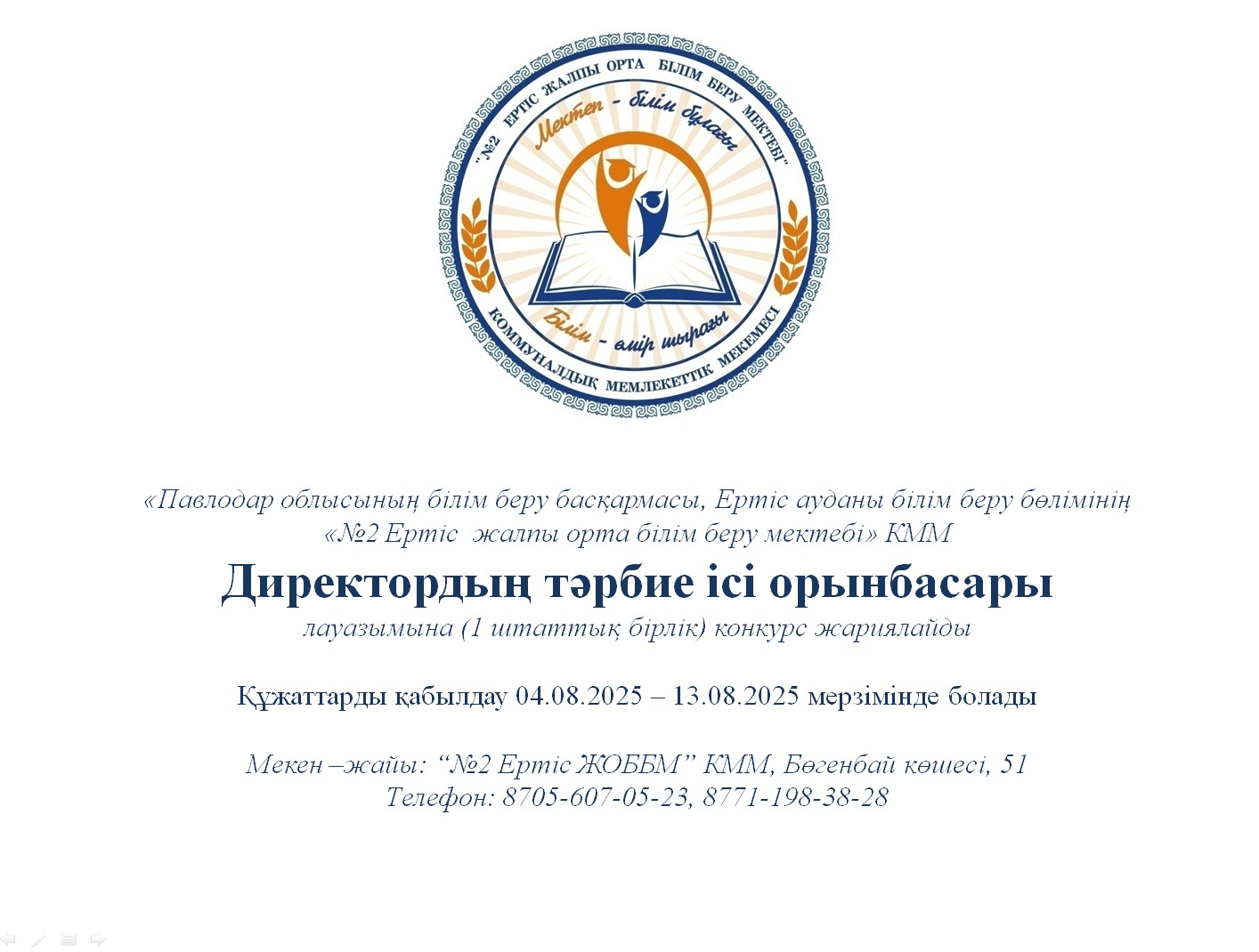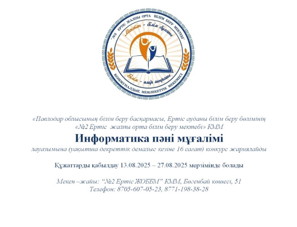 - Информатика пәні мұғалімі (16 сағат) Құжаттарды қабылдау 13.08.2025-27.08.2025 аралығында Бөгенбай батыр көшесі, 51 үй мекен жайы бойынша қағаз жүзінде қабылданады