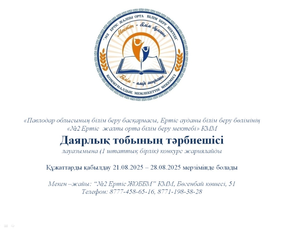 Павлодар облысының білім басқармасы, Ертіс ауданының білім бөлімінің «№2 Ертіс жалпы орта білім беру мектебі» КММ мемлекеттік тілде келесідей мамандықтарға конкурс жариялайды