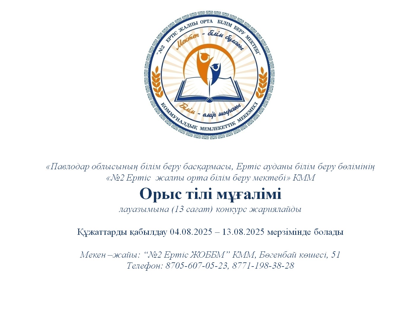 - Орыс тілі пәні мұғалімі лауазымына (13 сағат) конкурс жариялайды.